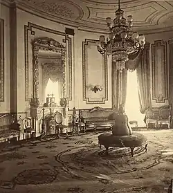A series of increasingly complex, highly patterned styles followed until 1902, when the room was returned to an Empire style by the firm of McKim, Mead & White during the administration of Theodore Roosevelt. The company fabricated a suite of chairs (painted white and gold) based on chairs made for Napoleon by François-Honoré-Georges Jacob-Desmalter.[7] Two new doorways were also cut into the walls to provide more access to the room.[8]