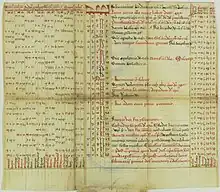 Latin 7478 consists of 17 folded leaves, perhaps previously attached to the tabs, but throughout the manuscript conservation it has obtained a new binding more like a traditional codex. It follows the pattern similar to what Johan Peter Gumbert calls H6r pattern: with the leaves opening on the top as well, then the first compartment unfolding the right, and only the last one on the left.[5][6] Latin 7478 has been copied by Paul of Kignin (could be also read as Szignin), whose autograph is found on folio 15, alongside with the supposed date of the manuscript production: 1456. The identity of the scribe remains to be investigated. However, some of the scholars presume that at least two people have been involved in the production of Latin 7478: a rather skilled almanac-maker, able to abbreviate diagrams and tables with a minimal loss of information, and a less experienced scribe, able to adapt 19-years cycles to a required date, lacking the knowledge to perform this procedure without distorting the time of syzygies.[7]