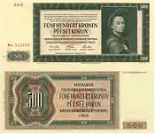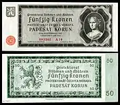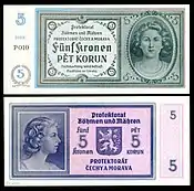 Czechoslovak banknotes for 1 koruna and 5 korun were stamped (and later printed) with "Protektorat Böhmen und Mähren" over "Protektorát Čechy a Morava," and subsequently issued in Bohemia and Moravia beginning on February 9, 1940.[8] These were followed by regular government issues of 1, 5, 50 and 100 korun in 1940,[9] 10 korun in 1942,[10] and 20 and 50 korun in 1944.[11] Nationalbank für Böhmen und Mähren in Prag (National Bank for Bohemia and Moravia in Prague) introduced 500 and 100 korun notes in 1942, followed in 1943 by overprinted Czechoslovak 5000 korun notes. In 1944, the National Bank issued regular 5000 korun notes.[11]