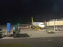 The concrete apron features a total of four parking bays for wide-body aircraft as large as the Boeing 777 and Airbus A330 or a maximum of seven parking bays for narrow-body aircraft like the Airbus A320 and A321.[14]