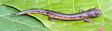 The type series consists of two adult females measuring 51 and 55 mm (2.0 and 2.2 in) in snout–vent length (SVL) and 92 and 104 mm (3.6 and 4.1 in) in total length. A subadult female measured 34 mm (1.3 in) SVL. The snout is truncate in dorsal aspect and rounded in profile. The tail is strongly constricted basally. The limbs are relatively slender and long; the digits are moderately webbed. The upper parts are grayish brown or brownish olive with small, inconspicuous, irregularly shaped buff-yellow spots. The ventral surface is uniformly buff-yellow (holotype) or brownish olive with buff-yellow blotches (paratype).[2]