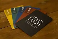 Boon is a trick-taking card game, based on the German card game Sheepshead.[1] It was released in 2015.[2] Though the rules of Boon are analogous to those in the game Sheepshead, Boon uses a specialized deck which corresponds directly to the rules of the game. This is different than Sheepshead, which is played with 32 cards from the Standard 52-card deck. Boon can be played with three or four players.