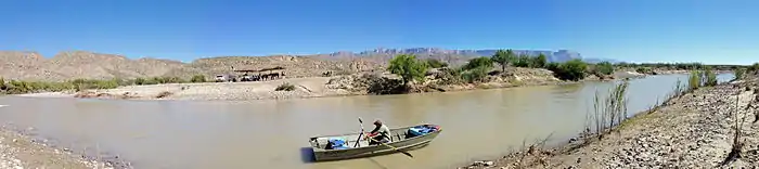 The Boquillas Port of Entry is a port of entry into the United States from the Mexican town of Boquillas del Carmen to Big Bend National Park. Having opened in April 2013, it is a port of entry that is unstaffed by Customs and Border Protection agents, but at least one National Park Service employee is present when the port of entry is open. Persons entering from Mexico must report to the video inspection kiosks. Crossing of the Rio Grande may be accomplished by foot, rowboat or burro.[2] Previously, the Boquillas Port of Entry had been an informal border crossing for several decades, but was closed in May 2002.[3] It is the only unstaffed legal border crossing on the US-Mexico border and one of only four that allow only pedestrian traffic.