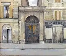 Between the west side of piazza Scossacavalli and the south side of Borgo Nuovo, the Caprini family from Viterbo let erect by Bramante their Roman residence.[15] The palace was then bought by Raphael, who completed it and spent there the last 3 years of his life, dying there in 1520.[46] Later, the building was enlarged, becoming the Palazzo dei Convertendi. Along Borgo Nuovo the palace had a monumental portal surmounted by a balcony, both designed by Baldassarre Peruzzi; the latter was considered the most beautiful in the whole city.[47][48] The Palazzo dei Convertendi was demolished in 1937 and rebuilt in 1941 west of Palazzo Torlonia with another plan but reusing original elements, included the portal with the balcony.[49]