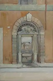 Next to the chapel, Pius VI had a small fountain built, consisting of a frame surmounted by an epigraph and his coat of arms; the water poured from a white marble putto's head with his cheeks outstretched because of the effort to channel the jet into a basin.[32] The fountain, very popular in the ward, was nicknamed "del Ricciotto" ("of the curly child") because of the head's curly hair.[32] Subsequently leaned against the front of the Carmelites convent on the opposite side of the road, and long believed to have been lost during the demolition works,[32] the fountain has been found in the municipal storerooms.[33]