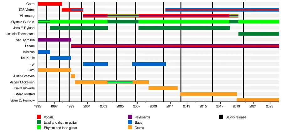 | Past members | Vintersorg Ivar Bjørnson Erik "Grim" Brødreskift Kristoffer Rygg Infernus Kai Lie Justin Greaves Asgeir Mickelson Tyr David Kinkade Jens F. Ryland Baard Kolstad |