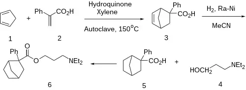 A Diels-Alder reaction between Atropic acid [492-38-6] (2-phenyl acrylic acid) (1) and cyclopentadiene (2) gives CID:139890006 (3). Catalytic hydrogenation over Raney-nickel gives 2-phenylbicyclo[2.2.1]heptane-2-carboxylic acid [93963-31-6] (5). Conversion of the acid to the acid chloride and esterification with 3-diethylaminopropanol [622-93-5] (4) completed the synthesis of Bornaprine (6). N.B. A small amount of hydroquinone serves the purpose of a polymerization inhibitor.
