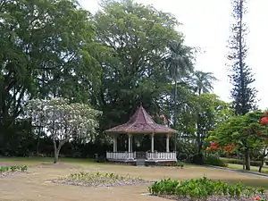The Rotunda lawns and beds, in association with the fig tree/rockery backdrop, are the primary focus and identity of the Park. The lawns slope down from the Bowen Bridge Road edge to the shrubbery border along the RNA showgrounds. The main path curves through the lower half from the southern corner at Bowen Bridge Road to the eastern corner at O'Connell Terrace. The bandstand rotunda and colourful central flower beds are the focal points of this area. This area contains evidence of the three major phases of garden development for the Park. The bunya (Araucaria bidwilli), hoop (Araucaria cunninghamii) and Cook (Araucaria columnaris) pines remain from the time of the QAS Gardens. The semi-circle of poinciana (Delonix regia) was established during the 1914 Council refurbishment and sits around an ornamental circular flower bed redesigned by Harry Oakman in the late 1950s.[1]