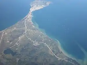 The link between the mainland (which itself is a bigger peninsula) to the west and Boztepe to the east is an isthmus of 1.5 kilometres (0.93 mi) length and only 300 metres (980 ft) width.[1] Thus the peninsula looks like an island and it is sometimes called "island".[2] The area of the peninsula is about 7 square kilometres (2.7 sq mi). The bay to the south of the peninsula (called İçliman) is a natural harbor sheltered from most winds except for the south east wind.[3] Because of this advantage historically Sinop was one of the most active ports of the Black Sea coast before the Battle of Sinop in 1853.[4]