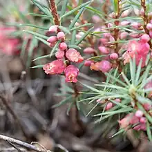 - Brachyloma eridoides subsp. ericoides[9] has leaves 5–12 mm (0.20–0.47 in) long, pink bracteoles, sepals and petal tube, and pink to reddish petal lobes.[4]