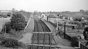 The Buckinghamshire Railway's station was built at the southern end of the main high street and was constructed of a yellow-grey coloured stone.[6] A single loop was enclosed between two-facing platforms, each of a height of 32 inches (0.8 m). A water tower for locomotives was positioned on the roof of a stone shelter situated on the up platform, slowly refilling from a nearby spring. The station's goods shed was built at a right angle to the line where a wagon turntable enabled vehicles to roll into the shed, aided by a slight gradient. A short spur on a severe gradient served the Hopkins and Norris brewery; horses drew the wagons up the gradient to allow them to be returned to the station yard by gravity. The spur (known locally as the "barrel line") fell into disuse in the early 1920s and the rails were lifted by 1935.[7] The station's goods yard was not large, but was capable of accommodating the daily 3 to 12 wagons destined for the gasworks and the 4 to 5 wagons of malt and sugar for the brewery. A cattle dock could take four vans, and a 5-ton capacity crane was stationed in the yard.[8]