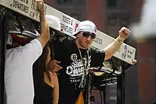 On September 7, 2012, the Bruins extended Marchand's contract by four more years, with his salary carrying an average annual value of $4.5 million.[46] When the 2012–13 NHL season was indefinitely delayed due to a lockout, many of Marchand's teammates struck deals to play in European hockey leagues, an option that Marchand met with trepidation.[47] He ultimately chose to wait out the lock-out, and did not play professional hockey until the season began in January 2013. Paired with Bergeron and Seguin, both of whom spent the lock-out in the Swiss National League, Marchand worried that he would be out of practice compared to his teammates.[48] He ultimately scored 18 goals and 18 assists in 45 games of the lock-out-shortened season, which in a regular 82-game year anticipated that he would have scored over 30 goals and recorded over 65 points.[24] As the Bruins entered the 2013 Stanley Cup playoffs, Marchand scored his first postseason overtime goal in Game 1 of the Eastern Conference semifinals against the New York Rangers.[49] The Chicago Blackhawks overpowered the Bruins in the 2013 Stanley Cup Finals, defeating a depleted roster in six games.[50]