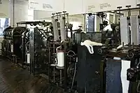 This gallery holds machinery from the last of the hot metal typesetting printshops as used in the newspaper industry. The monotype keyboard produces punched 31-level tape for casting on the monotype caster. The keyboard comprises seven QWERTY arrangements (Roman upper and lower case, bold upper and lower case, italic upper and lower case and small capitals). It is operated by compressed air and produces a wide paper tape that contains perforations that when transferred to the caster give full instructions for each character to be cast. The monotype system was widely used in the commercial printing sector.[6] There is a forme (text lines produced on a Linotype typesetting machine) made up into the front page of the last edition of the Yorkshire Sports, 2 May 1981. The assembled forme is ready to be moulded and cast into a curved printing plate.[6]