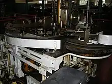 Here is machinery from the 19th century Industrial Revolution, including waterwheels, steam engines, oil engines and gas engines; plus an engineer's workshop display.[4] The millstone is from Castlefields corn mill near Bingley; it is a bedstone carved from local millstone grit.[5] A spindle passes through this and a similar upper runner stone; the grain enters via the spindle hole and is ground by the scissor-action of the grooves when the runner stone rotates against the bedstone. The grain is forced out at the outer edges as flour, then flows into a sack.[6] The prime exhibit, a uniflow steam engine rescued from Linton mill and known as the Linton engine,[7] was one of the last Bradford-made steam engines. There is a display explaining the history of steam power.[4]