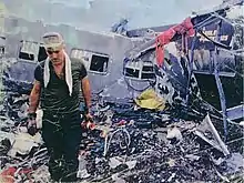A member of the rescue team. Behind him, a shattered passenger coach