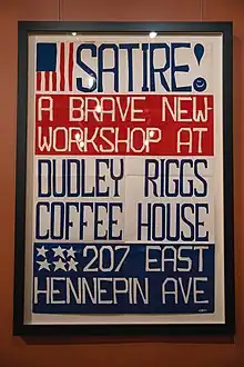 Brave New Workshop was founded in 1958 by Dudley Riggs, a fifth-generation circus aerialist who performed all over the globe. Riggs's parents were circus and vaudeville performers, and he regularly joked that he ran away from the circus to find a home. BNW was originally known as the “Instant Theatre Company.” Riggs assembled and led a talented group of writers and performers intending to make people think by first making them laugh. In the late ’50s, the troupe travelled to Minneapolis and performed at a restaurant called Steffano’s. The Instant Theater Company then decided to stay in Minneapolis and create a performing space for themselves; "Dudley Riggs' Cafe Espresso" opened in a former garage at 18 University Avenue SE. In 1961 the venue relocated to 207 E. Hennepin Avenue, and after much planning and brainstorming, and with help from friends Dick Guindon, Irv Letofsky, and Dan Sullivan, this would be the beginning of the satirical comedy theatre that was known for many years as Dudley Riggs' Brave New Workshop.[1][2][3][4] Four years later, in 1965, the theatre moved to 2605 Hennepin Avenue, a space that had been a bicycle shop, and would be home to the theatre for most of the following four decades.[5]