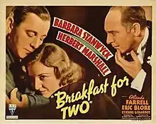 Breakfast for Two is a 1937 American screwball comedy film directed by Alfred Santell and starring Barbara Stanwyck, Herbert Marshall and Glenda Farrell.[1] The film was produced and distributed by RKO Pictures, but was a commercial failure for the studio.[2] Stanwyck and Marshall worked together once more, immediately following this film, on the 20th Century-Fox drama Always Goodbye (1938).[3]