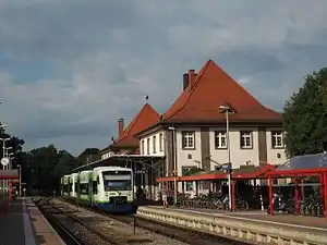 Breisach station (German: Bahnhof Breisach) is a station in Breisach in Baden-Württemberg, Germany. It is now the starting point of the Breisach Railway (Breisacher Bahn) to Freiburg and the Kaiserstuhl Railway (Kaiserstuhlbahn) to Riegel. The Breisach Railway crossed the Upper Rhine, running from Breisach to Colmar in France, until the destruction of the Breisach rail bridge in 1945.