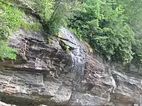 Bridal Veil Falls flows on a tributary of the Cullasaja River through the Nantahala National Forest. The falls flows over an overhanging bluff that allows visitors to walk behind the falls and remain dry when the waterflow is low. During periods of drought, the stream may nearly dry up, though visitors will get wet if the waterflow is moderate or high.