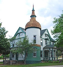 The Brinkerhoff–Becker House was built in 1863–69,[2] likely for Hezekiah H. Brinkerhoff, an insurance and real estate agent. The Brinkerhoffs lived in the house until Hezekiah's death in 1885; his widow and Sarah E. Brinkerhoff, continued to own the property until 1890.[3] It was eventually purchased by J. M. B. Sill, one of the early Principals of the Michigan State Normal School (now Eastern Michigan University).[4] Charles J. Becker purchased the house in 1891 and remodeled it to include the prominent tower.[2] The Becker family lived there until approximately 1918. It was later remodeled into apartments.