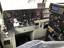 The driver's cabs have also been heavily modernised, the changes include the installation of new measures to reduce the levels of both noise and vibration that the occupants are exposed to.[5] Insulation has been fitted along with additional heater and fan units to provide greater comfort to the driver. To the right of the driver's position is the EMD power control pedestal, while the controls for the multiple braking systems have been installed to their left.[5] Safety equipment includes the latest Mark IV version of the Train Protection & Warning System (TPWS) and the Automatic Warning System (AWS), while space has also been provisioned for the potential future installation of ETCS apparatus.[5]