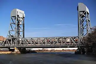 The bridge measures 558 feet (170 m) long, including approaches.[2][9] The lift span is 304 feet (93 m) long[2][10][11] and sits 25 feet (7.6 m) above mean high water in the "closed" position, though it can be raised to 136 feet (41 m) above mean high water.[12][13] It weighs 2,600 short tons (2,300 long tons; 2,400 t)[13] and is composed of two Warren trusses.[11] The lift span is supported by the lift towers at each end, which rise 160 feet (49 m) above mean water.[13] The lift span is suspended by two sets of 12 wire ropes at each corner. Each rope is wrapped around counterweights on each end: at the top of each tower and on the span. The span can be lifted by one electrical drive in each tower. The tops of the lift towers were tapered to be flush with the top of the lift span.[10][13]
