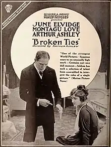 Broken Ties is a 1918 silent film starring June Elvidge, Montagu Love, and Arthur Ashley. Ashley also directed the film. It was a William A. Brady World Pictures production. It was marketed as containing "not one dull moment". The film was based on Arthur M. Brilant's play The Alibi. The film received generally positive reviews.[1] A write-up in Motography describes it as a tense drama.[2] One aspect of the plot is a father forbidding his son from seeing a young woman believed to have mixed ethnic heritage.[2]