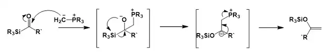 The second category of anionic brook rearrangements involves nucleophilic attack at an sp2 hybridized center to generate an oxy-anion two atoms removed from the silicon atom. This can then undergoes intramolecular attack by the oxy-anion to yield the silyl ether, but the final fate of the carbanion often depends on the substrate in question. For example, attempting to perform a Wittig reaction on acylsilane results in the formation of a silyl enol ether instead of the expected alkene, due to elimination by the carbanion instead of protonation as seen above.