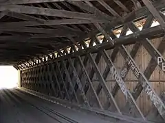 The bridge was listed on the National Register of Historic Places in 1974. It is one of about 110 surviving Town lattice truss bridges built before 1955, and was identified as one of a few high-quality covered bridges in a nationwide survey conducted by the National Park Service in the 2000s.[2] The bridge was designated a National Historic Landmark in 2014.[3]