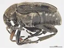 Bruchus rufimanus, commonly known as the broadbean weevil, broadbean beetle, or broadbean seed beetle is a leaf beetle which inhabits crops and fields, as well as some homes. It is a pest of faba beans (Vicia faba L.). The adult beetles feed on pollen, while their larvae tunnel in seeds destroying crops and moving on to new ones once they dry out. The adult beetle, being one of the biggest of its genus, ranges from 3 to 5 mm in length.