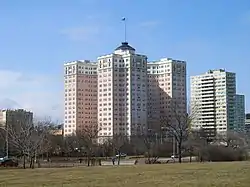 This structure, dating to 1928, is the extension wing of a lavish hotel complex, the Edgewater Beach Hotel. Although once popular with celebrities and the elite, the extension of the Lake Shore Drive cut the hotel from the beach and led to its demolition. The building is listed on the National Register of Historic Places.