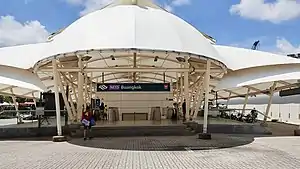 Unlike the other NEL stations, the entrances of Buangkok station do not employ glass in their design; white Teflon sheets supported by metal frames envelop the entrances.[30] The station is designated as a Civil Defence (CD) shelter:[31][32] it is designed to accommodate at least 7,500 people and withstand airstrikes and chemical attacks. Equipment essential for the operations in the CD shelter is mounted on shock absorbers to prevent damage during a bombing. When the electrical supply to the shelter is disrupted, there are backup generators to keep operations going.[33] The shelter has dedicated built-in decontamination chambers and dry toilets with collection bins that will send human waste out of the shelter.[34]