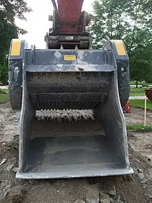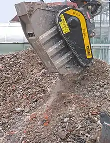 The jaws are driven by hydraulically actuated eccentrics which crush material to a desired particle size. Bucket crushers are primarily employed in mining and demolition for the breaking-down of crude minerals, concrete and masonry.[1]