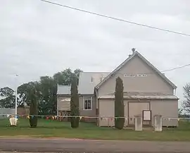 The remains of a Community Hall,[6] Fire Station, Post Office and grain silos beside the railway line are all that is left. A church used to operate but was destroyed in a windstorm.