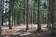 In addition to the ongoing improvements being undertaken throughout the Buderim district by the BWMCC, in July 1946 a proposal for the establishment of an "arboretum" was adopted. It was hoped that "the laying of an arboretum planted with suitable trees … will add beauty to an already fine natural setting".[59] In December of that year this came to fruition, with the planting of a further 600 trees, comprising 10 species, in the reserve beside the sports ground and the recently planted pine forestry plot at the school. The Buderim War Memorial Arboretum was planted by a large number of community members, including 50 children from the school, and would "serve to perpetuate the memory of those who served in the last two wars".[60] The pine forest was included as part of the war memorial.[1]