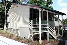 In 1959 another classroom building, Block C, was constructed. Highset on concrete posts, it was a timber-framed and weatherboard-clad building with an 8-foot (2.4 m) wide verandah on the north side used as circulation to a single, south-facing classroom 21 by 24 feet (6.4 m × 7.3 m). The earlier buildings on the site had been built parallel to the site boundaries but Block C disregarded this and was built at an angle to face directly north, which was characteristic of the standard type.[65] Designed by the Department of Public Works, the type (High Set Timber Building with Semi-enclosed Stair, F/T4) was introduced in c. 1950 and built into the 1960s. (Despite its name, the type did not always include a semi-enclosed stair.) This type was typically long buildings of multiple classrooms and it was planned for Block C to be extended on its eastern end with further classrooms but this did not occur.[66] Block C included typical variations of features introduced into later versions of the type - a bag-rack balustrade on the verandah and louvres in the verandah wall. In c. 1966 the original stair on the west side of Block C was removed and refixed on the northern side in a reconfigured L-shape with generous awning roof. In c. 1976 it was remodelled for administration use with partitions built to accommodate smaller offices. This work was reversed in c. 1986 with the partitions removed and the space reverting to a single classroom.[67][68][69][70] The understorey had a concrete floor and was used as semi-enclosed covered space with a perimeter bench seat. The southern and verandah walls were extensively glazed, providing abundant natural light and ventilation to the classroom.[1]