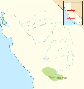 The dialect was "formerly spoken in at least two local varieties around Buena Vista Lake in Kern County, California,"[2] in the villages of Hometwoli, Loasau, Tuhohi, and Tulamni.[3]