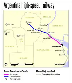 The Buenos Aires–Rosario–Córdoba high-speed railway (Spanish: Tren de Alta Velocidad de Argentina – TAVe) was a project designed to link the Argentine cities of Buenos Aires, Rosario and Córdoba through a 710 km (440 mi) high-speed rail network. The plan, announced by then-President Néstor Kirchner during a press conference at the Casa Rosada on 26 April 2006,[2] would have been the first in Argentina[3] operating at up to 320 km/h (200 mph).[4] The entire project was dismissed due to the financial crisis of 2007–08.[5]
