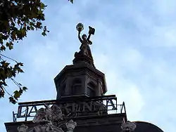 Completed in 1898, the new La Prensa offices was inaugurated in a ceremony attended by around 20,000. The Beaux-Arts exterior is notable also for its spire, which is topped by a gilt bronze monument to freedom of the press represented by Pallas Athena and created by French sculptor Maurice Bouval (of Thibaut Frères). Bouval's Athena stands 50 m (164 ft) above the ground and holds an electric lamp representing Prometheus' sacred fire.[1]