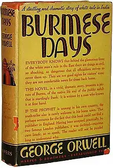 Burmese Days is the first novel by English writer George Orwell, published in 1934. Set in British Burma during the waning days of empire, when Burma was ruled from Delhi as part of British India, the novel serves as "a portrait of the dark side of the British Raj." At the centre of the novel is John Flory, "the lone and lacking individual trapped within a bigger system that is undermining the better side of human nature."[1] The novel describes "both indigenous corruption and imperial bigotry" in a society where, "after all, natives were natives—interesting, no doubt, but finally...an inferior people".[2]