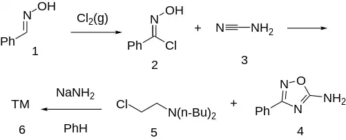 USA Ex 9: The halogenation of benzamidoxime [932-90-1] [622-31-1] (1) with chlorine and subsequent reaction with cyanamide (3) gives 5-amino-3-phenyl-1,2,4-oxadiazole [3663-37-4] (4). Base catalyzed alkylation with dibutylaminoethyl chloride [13422-90-7] (5) completes the synthesis of butalamine (6).