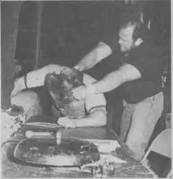 Sawyer was known for his antics both in and out of the ring, including his drug abuse and fighting with police outside a bar.[10] Most notably, he was known for scamming aspiring wrestlers who wanted to be trained by him - Sawyer would often take their money, beat them senseless, then skip town. Mark "The Undertaker" Calaway recounted on Joe Rogan's podcast The Joe Rogan Experience that he was a victim of this scam, however also highlighted that at that time this was a common way to whittle prospective wrestlers to only those dedicated to becoming professional wrestlers (though Calaway also indicated Sawyer's service was still a scam).[11][12] Jim Cornette has stated his reason for breaking Buzz's nose with a tennis racket during a spot was due to him taking liberties with other talent (Cornette included, as Sawyer threw a shoot punch at Cornette during a match).