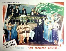 By Whose Hand? is a lost[1] 1927 American silent crime drama film directed by Walter Lang and released by Columbia Pictures.[2] Filmed before as a silent directed by James Durkin in 1916. An early talkie remake was made in 1932 by Benjamin Stoloff.