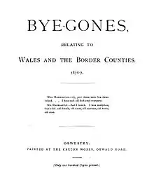 Bye-gones was a 19th-century quarterly antiquarian journal which covered Wales and the border counties. It was first published in the 1871, by Woodall, Minshall and Company of Oswestry. John Askew Roberts (1826-1884) (who had previously served as the Oswestry Advertizer's editor), edited the journal, which contained antiquarian articles that had originally been published in the Oswestry Advertizer and Border Counties Herald.[1][2]