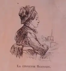 Hardouin was incarcerated at Versailles, first in the Orangerie,[5] then in the Chantiers prison for women and children.[1][5] She took the initiative to teach children there, until they were separated.[6] She was then transferred to the prison on the rue de Paris, where she met Louise Michel.[6]