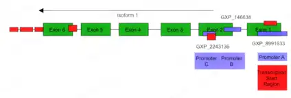 Transcription variant 3 has a size of 1706 bases and 6 exons.[12] This variant has an alternative spliced site in the coding region and differs in the 5’ UTR, but it still maintains the reading frame seen in transcript variant 1.[8] Despite their differences in size, variant 2 and variant 3 encodes the same protein isoform and this second protein isoform is shorted than the protein isoform encoded by transcript variant 1.