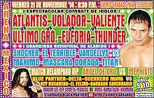 The November 14th Super Viernes show was the first time Ángel de Oro appeared on the show after he won the CMLL World Light Heavyweight Championship a few months earlier. Ángel de Oro teamed up with Mexican National Welterweight Champion Titán and Valiente taking on Mexican National Light Heavyweight Champion Mephisto teaming up with his regular partner Ephesto as well as Japanese wrestler Kamaitachi for a Six-man "Lucha Libre rules" tag team match. During the match Mephisto tried on multiple occasions to pin Ángel de Oro while using the ropes for an illegal advantage, but in the end Ángel de Oro gave Mephisto a taste of his own medicine, pinning him while HE himself held onto the ropes for leverage. After the show CMLL indicated that the interaction between Ángel de Oro and Mephisto was more than an isolated incident as they announced the two facing off in a Lightning Match on the following week's Super Viernes show. Following the third match Chavo Guerrero Jr. and Hernandez, two non-CMLL wrestlers came to the ring to promote a show called "All Elite" that featured a number of CMLL wrestlers working with wrestlers on the Mexican independent circuit. The opening match marked only the second time luchador Esfinge appeared on a Super Viernes show, having first appeared on the September 26 Super Viernes.[1][2] In his second appearance he teamed up with Stigma and gained his first victory as the duo defeated Disturbio and Nitro in the first match of the night.