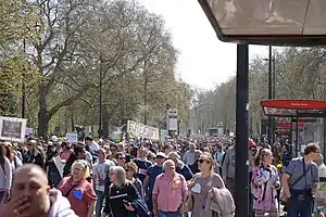 On 20 March, up to 30,000 people gathered in central London, walking from Hyde Park to Westminster. Although the protest was largely in relation to the government's stance on peaceful protests during lockdown, many were seen carrying anti-lockdown placards with slogans such as "Stop Destroying Our Kids’ Lives" and chanted for restrictions to be lifted. A number of arrests were made, predominantly in relation to breaches of COVID-19 regulations.[51][8]