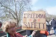 Anti-lockdown protests took place in opposition to restrictions, starting in April 2020 against the first national lockdown, and continuing during subsequent lockdowns and other regional restriction systems. These overlapped with anti-vaccination protests, which continued after the start of the UK's vaccination programme in December 2020. Several media outlets blamed online COVID-19 misinformation, denialism and conspiracy theories as driving factors in the protest movement.[2][3][4][5][6] The Economist described the protests as "countercultural" and attracting people from a variety of demographics and political leanings.[7] Hundreds of protesters have been arrested for violating lockdown restrictions, social distancing measures and other public health laws.[8]