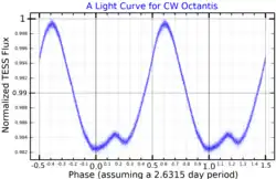 This object is classified as a Alpha2 Canum Venaticorum variable.[7] Most stars of this class have chemical peculiarities in their spectra, but CW Octantis seems to be ordinary. Renson and Manfroid (2009) consider its peculiarity status to be doubtful.[17] Nevertheless, CW Octantis fluctuates between 6.05 and 6.07 in the Hipparcos passband within 2.63 days.[18] It takes 2.8 days to complete a full a rotation, which corresponds to a projected rotational velocity of 92 km/s.[13]